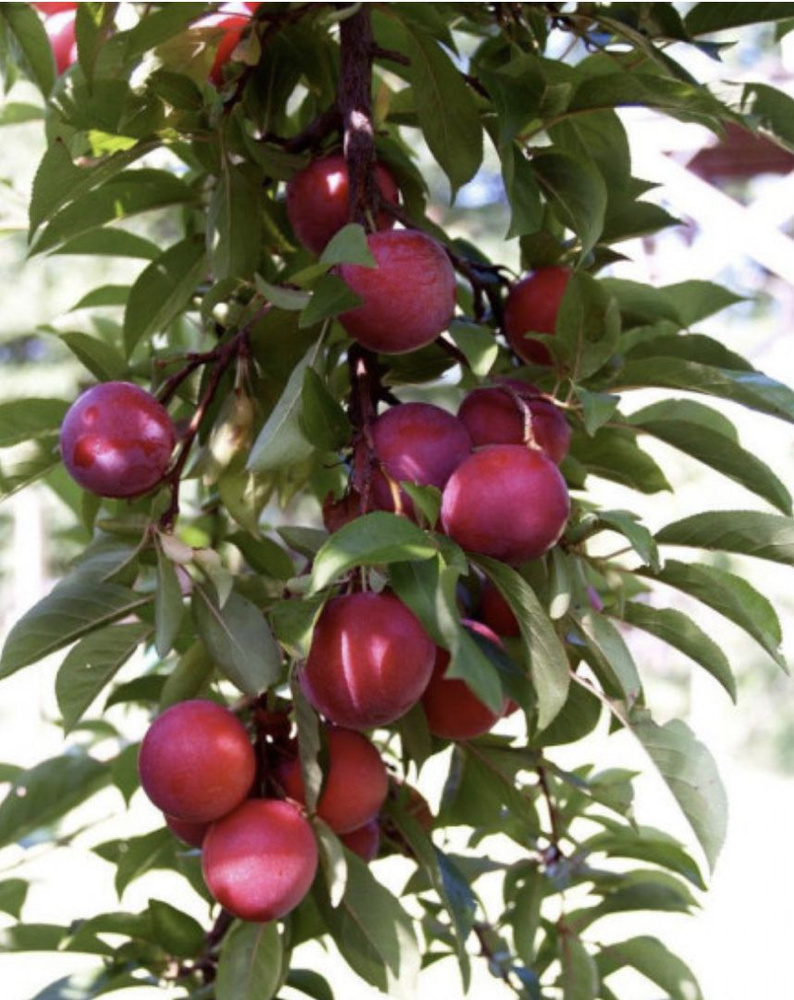 Шарафуга "Вельвет Санрайз" – это идеальное решение для тех, кто стремится возделывать на своём участке вкусные и здоровые фрукты. Этот сорт, отличающийся самоплодностью, славится повышенной резистентностью к болезням и вредителям, а также не требует сложных условий для выращивания. Плоды Шарафуги Вельвет Санрайз характеризуются необычным фиолетовым оттенком. Они крепятся к дереву на небольшой плодоножке. Отличаются крупным размером, достигая веса от 70 до 150 г и диаметра в 8-10 см. Форма плодов напоминает абрикосы, в то время как текстура скорее схожа со сливой. Мякоть плотного строения, с розовым красным цветом с ярко выраженными золотистыми или красноватыми жилами. Вкус плодов зависит от их зрелости. Неспелые сливы обладают слабым сливовым ароматом, в то время как зрелые изобилуют абрикосовым привкусом. Мякоть может быть как сладкой, так и кислой, но всегда сочной и приятной на вкус.