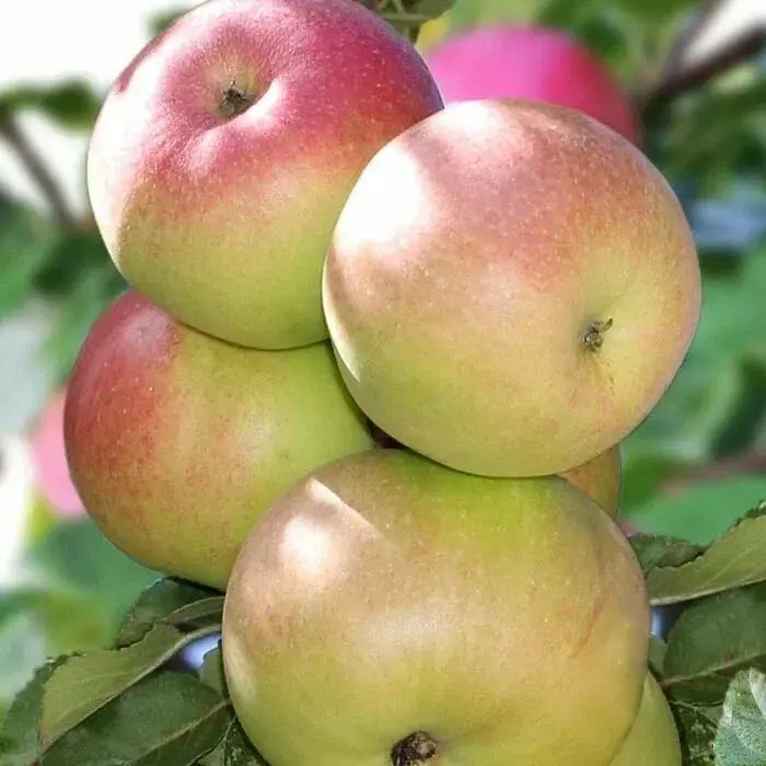 Растение вырастает в высоту не более 4,5 м. Плоды небольшие, весят от 90 до 180 г. Форма яблок коническая, продолговато-округлая. Кожура прочная, тонкая, гладкая, жёлто-зелёного или жёлтого оттенка. Мякоть белая с легким розовым оттенком, сочная. Аромат не ощутим, вкус сладкий с лёгкой кислинкой. Первый урожай собирают к третьему году после посадки. С молодой яблони получают 20-65 кг, с взрослого растения – до 70 кг. Правильный уход позволит продлить плодоношение дерева до 50 лет. Созревание плодов приходится на середину или конец июля-начало августа. Срок хранения составляет не более 2 недель.